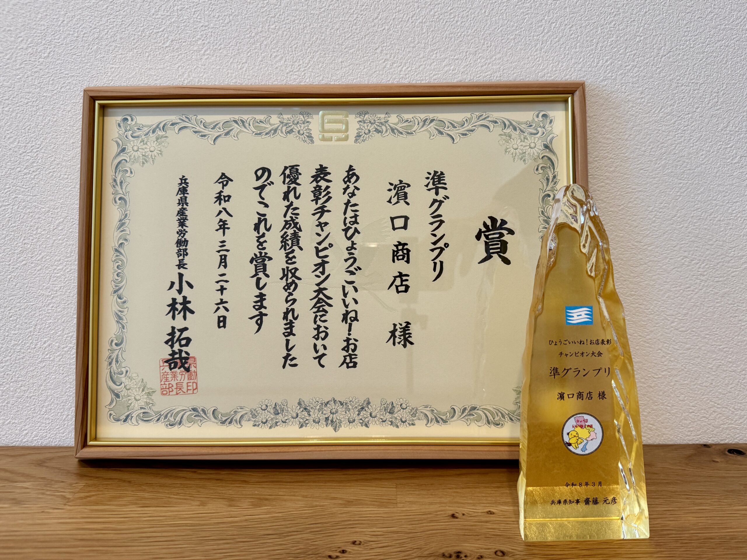 兵庫県が実施する表彰事業「ひょうごいいね!お店表彰」において、最高賞の「大賞(知事賞)」という大変栄誉ある賞を受賞させていただきました。